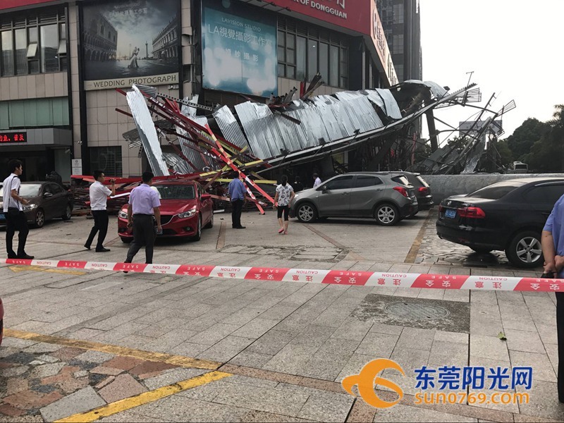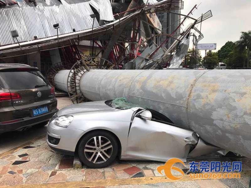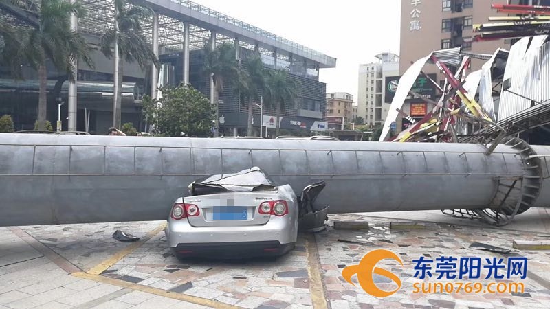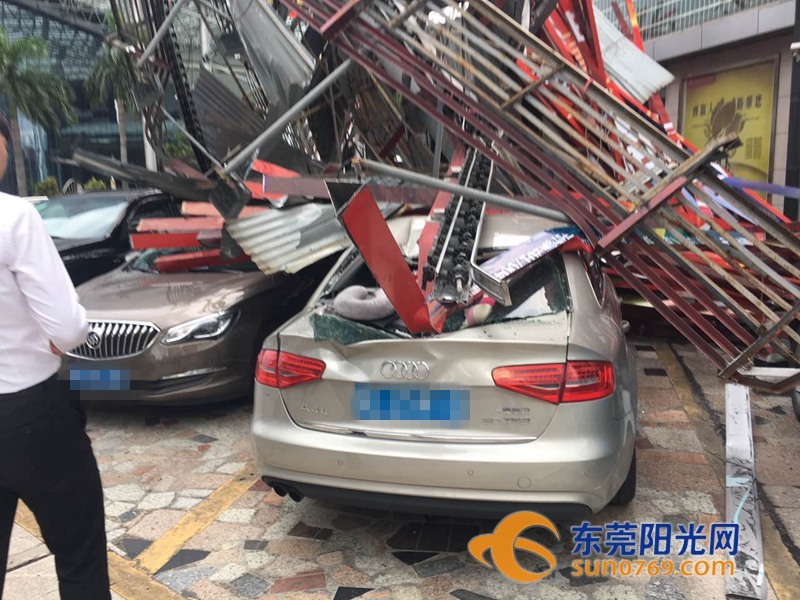 9月4日中午,根據(jù)廣東東莞網(wǎng)友爆料稱,位于東莞市東莞大道輔道一怡豐路十字路口一個大型廣告牌倒塌導致停車場內多車受損嚴重,有幾輛車直接被壓扁,完全報廢,不過慶幸的是沒有造成人員傷亡。