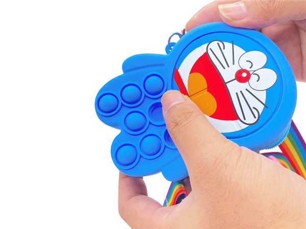 解壓卡通錢包采用卡通人物形狀生產定制而成,此硅膠產品在原定基礎上升級改款,加入適當按壓泡泡結構,加多解壓游戲功能,提升了兒童錢包功能與實用性,表面圖案采用色塊二次加工成型,表面圖案單獨印刷完成后在進行二次加工成型,所以可隨時更換不同的印刷圖案,既達到不同風格效果有做到解壓雙重功能。